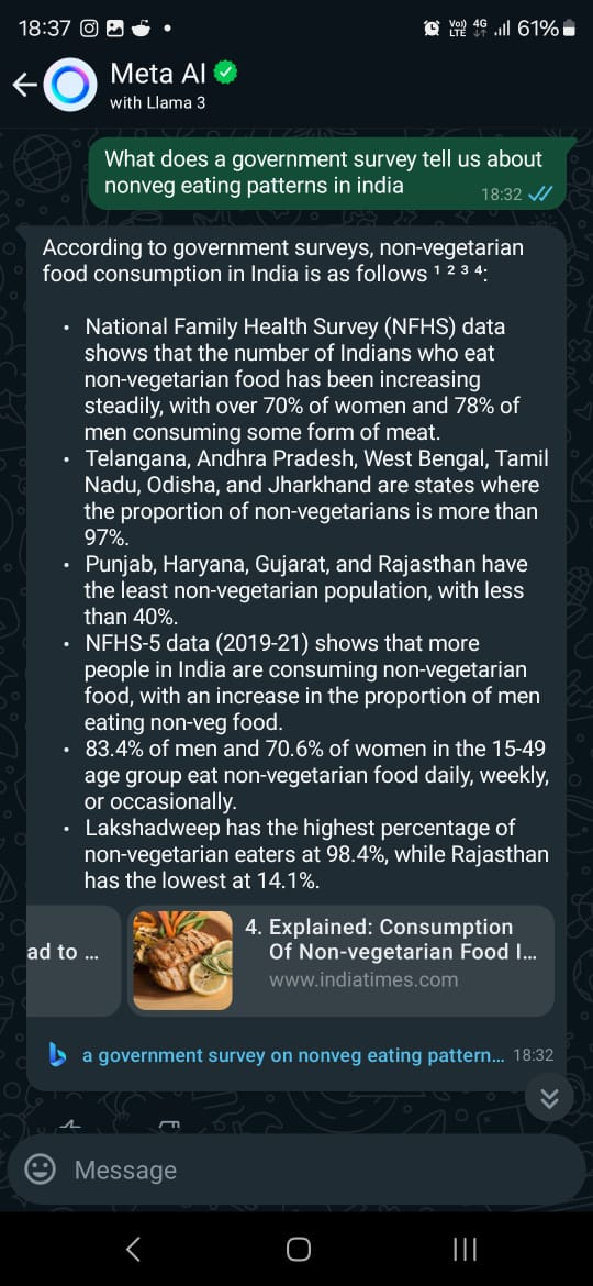 I asked it a bunch of questions about what it could do. It can write code, review grammar, search the internet and specific sites for specific details, generate creative text, and rewrite copy-pasted content. This was a win. In a place like WhatsApp, where we idle and scroll between chats and talk with our colleagues, family, besties, and NSFW and brain rot friends, this handy tool is perfect. For a better WhatsApp experience. I’m not saying a better AI experience; I’m highlighting a better WhatsApp experience.